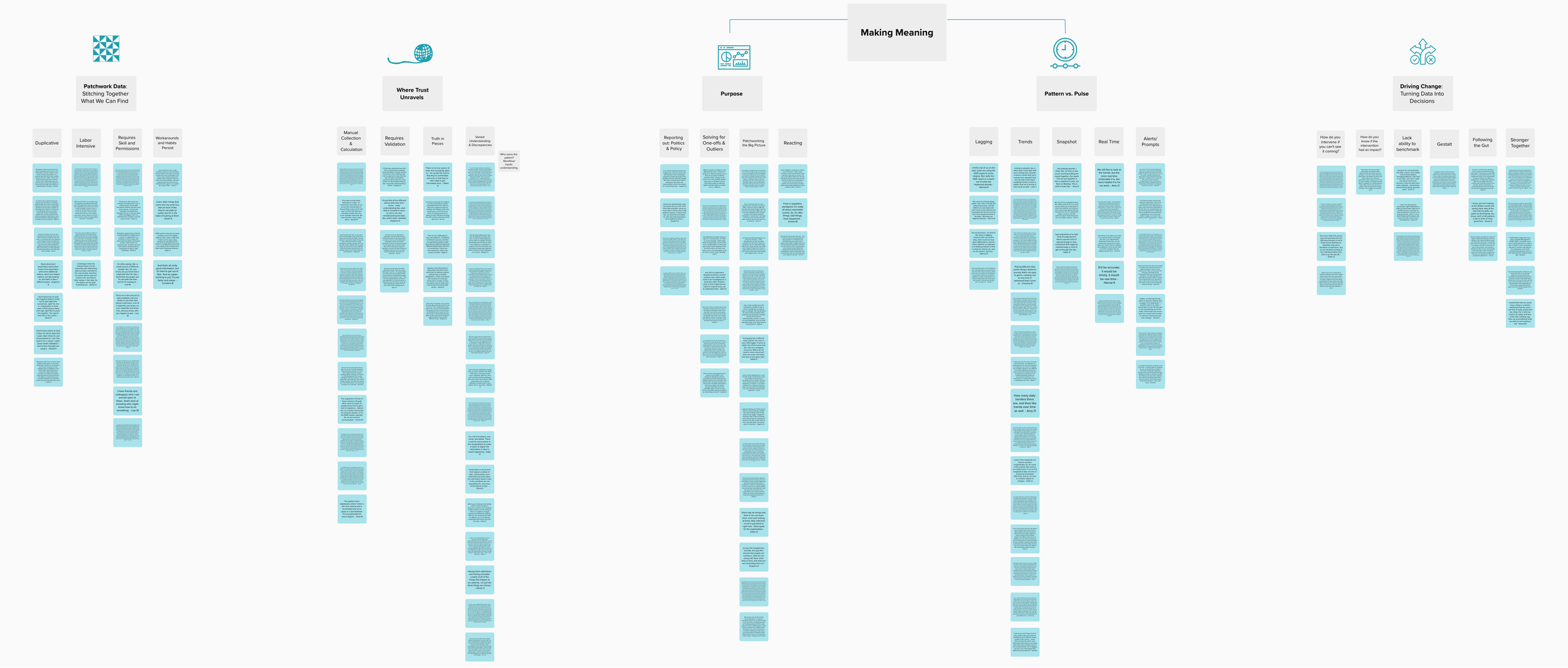 The team aligned on what we wanted to learn from our stakeholders. Through semi-structured interviews with 22 stakeholders across ZSFG, I explored how leadership and teams define success, access data, and make decisions. The synthesis revealed five recurring themes: